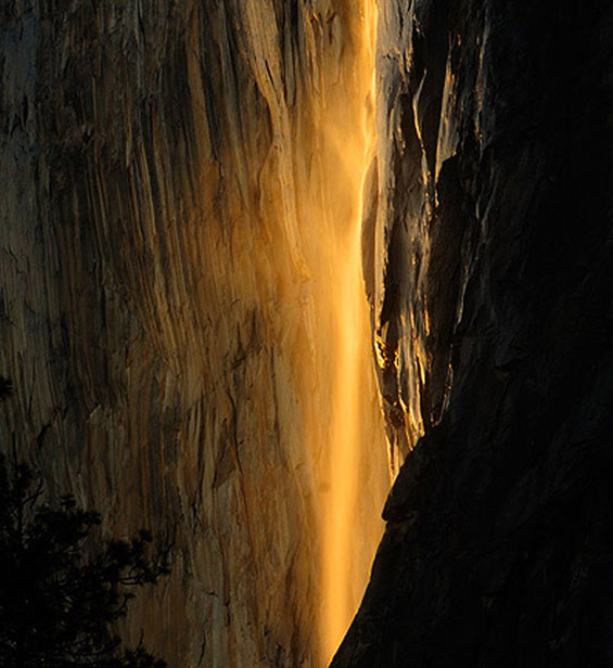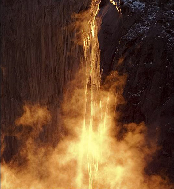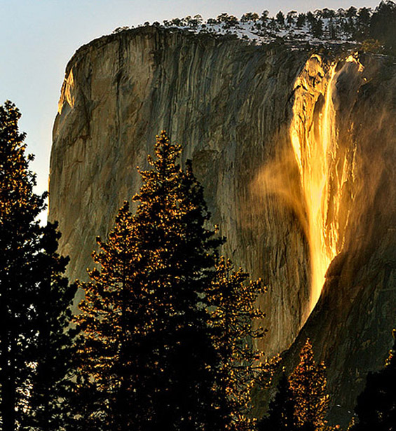 Едно од најфасцинантните места во светот е златниот водопад „Коњска опашка“ (Horsetail Falls), лоциран во националниот парк Јосемити во Калифорнија. Паѓа на источната страна од природно извајаната вертикална карпа Ел Капитен и вака изгледа само еднаш годишно, во зима или рано напролет. Силното сонце кое полека заоѓа, во еден момент фрла совршена златна светлина врз водопадот, заради која кристално чистата вода започнува да наликува на вулканска лава. Вистинска вонземска убавина, која за жал трае само две недели во годината.