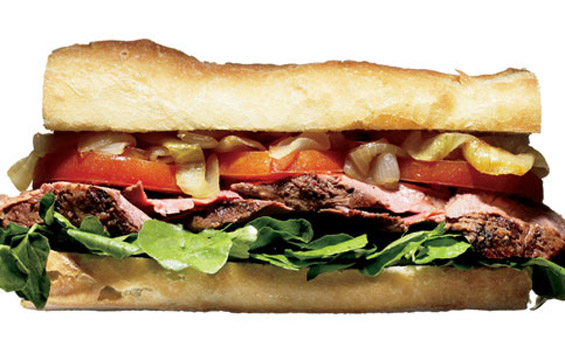 Во багетот ставете парче бифтек, а врз него кромид динстан во маслиново масло, домати, поточарка и сенф.