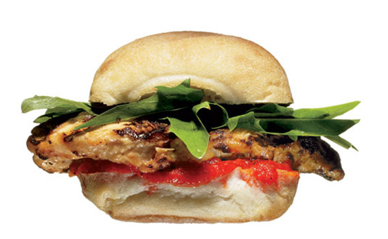 Направете пире од печена црвена пиперка, маслиново масло, вински оцет и сол, а потоа намачкајте го на чијабата. Потоа додајте парче печено пилешко, рукола и други зачини по желба.
