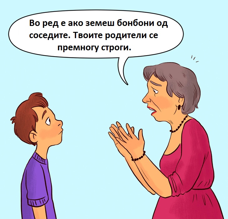 Родителите многу добро знаат кои играчки ги имаат деца и кои навистина им се потребни. Покрај тоа, кога одбиваат да им купат сè што ќе посакаат, тие ги учат своите деца да ги ценат парите и да ги трошат мудро. Кога се мешаат во овој процес, бабите и дедовците му прават лоша услуга на детето.