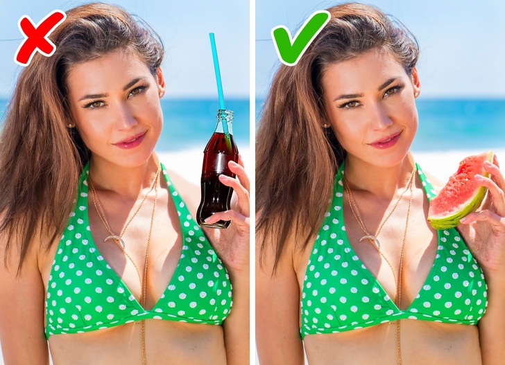 За стомакот да ви остане што е можно порамен, немојте да јадете премногу пред да одите на плажа. Покрај тоа, избегнувајте продукти кои предизвикуваат подуеност. Овде спаѓаат грашок, зелка, пченка, крекери, колбаси, како и газирани пијалаци и коктели. Иако ладните благи пијалаци се привлечни на жешко време, тие брзо ќе го покачат вашето ниво на енергија кое уште побрзо ќе се намали, па ќе се чувствувате изморено. Најдобро е да пиете вода и да јадете овошје и јаткасти плодови. Јаткастите плодови ќе ве заситат, а овошјето навистина ќе ве освежи. Најдобро е да јадете банани, лубеница и цитрусно овошје. Држете се настрана од јаболка, круши, грозје и суво овошје бидејќи тие предизвикуваат гасови.