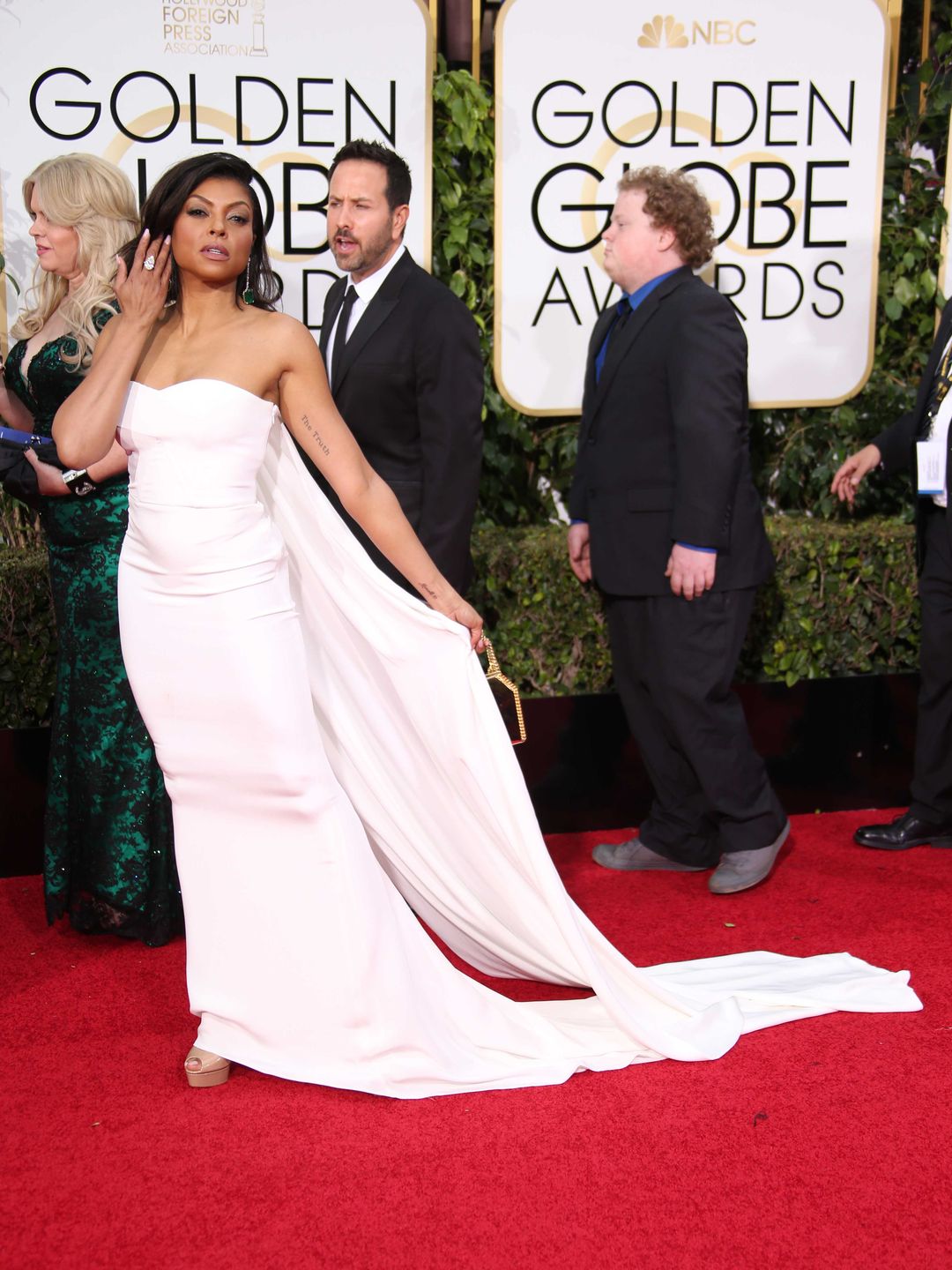 Тараџи го прошета црвениот тепих во целосно бела вечерна тоалета на Стела Мекартни. Актерката го закити својот изглед и со еден златен глобус за најдобра изведба на актерка во ТВ серија/драма за нејзината улога на Куки во серијата „Империја“.