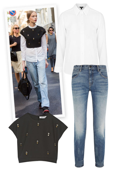 Тесниот кроп топ врз бела кошула ја претвора секоја работна комбинација во комбинација за секаде. Не ни морате да се трудите да ја пикнете кошулата во пантолоните. Едноставно нема потреба.
