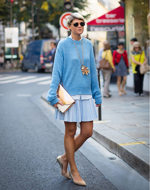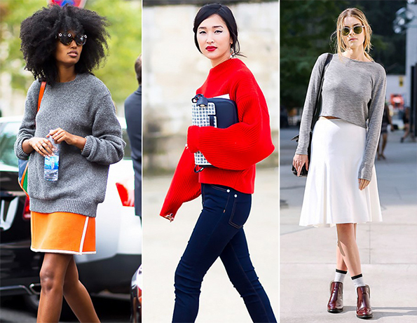 Исечениот џемпер со здолниште во А–линија во комбинација со сако, лесно ќе ве натера да блесне модерната бизнис жена во вас. Секојдневен изглед ќе добиете со бели фармерки, голема чанта и плетен топол пуловер.