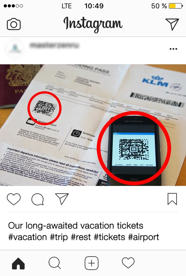 Многу патници објавуваат фотографии од аеродроми со нивните билети, со цел да ги доловат емоциите што ги чувствуваат поради нивниот долгоочекуван одмор. Доколку и вие го правите ова, внимавајте! Бар кодот на вашиот билет е единствен и може да се искористи за да се добијат вашите лични информации што сте ги оставиле кај авионската линија. Корисниците прават и други слични грешки: Кога сакаат да се пофалат поради тоа што добиле нова ВИП кредитна картичка или возачка дозвола, тие споделуваат фотографии на социјалните мрежи. Запомнете дека објавувањето такви слики воопшто не е добра идеја.