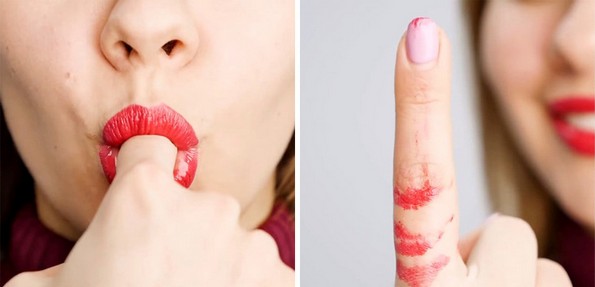 За да ги избегнете дамките од кармин на забите, поставете ги усните во форма на буквата О, ставете го прстот во устата и бавно извадете го. Вишокот кармин ќе остане на прстот и нема да заврши на вашите заби.