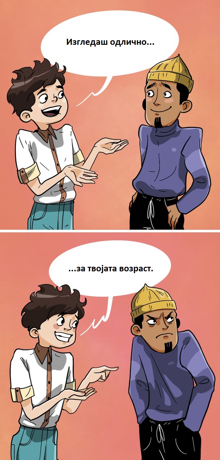 Кога некој ќе го каже ова, ве тера да се запрашате дали тоа значи дека изгледате одлично и покрај тоа што сте стари. Сепак, тоа може да биде вистински комплимент (иако формулиран лошо), така што едноставно може да го сфатите како добра работа. Или може да кажете: „Благодарам. Но, мислам дека годините се само бројка.“