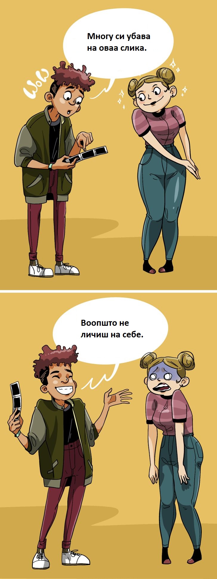 Ова може да звучи како навреда затоа што личноста остава впечаток како да вели дека сликата е убава затоа што не личите на себе. Вие можете само да се насмеете или да кажете: „Благодарам. Изгледам многу подобро во реалниот живот, нели?“ само за да ја видите нејзината реакција.