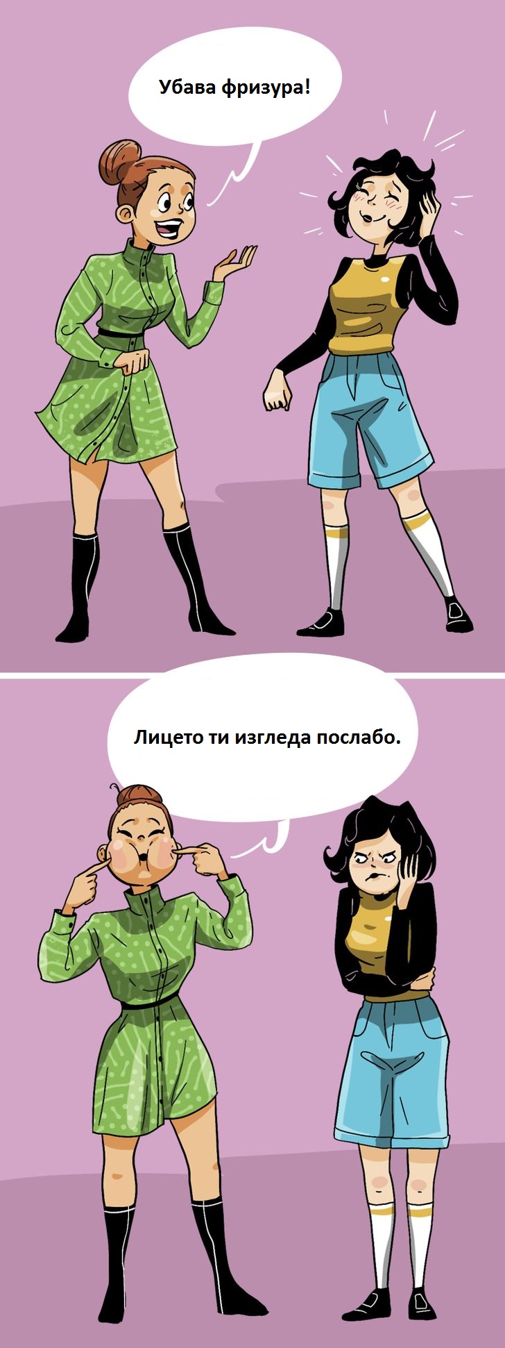 „Леле, денес навистина изгледаш убаво. Шминката навистина има магично дејство.“ Ова е совршен пример за двосмислен комплимент, каде што забелешката звучи пријатно, но всушност е побрутална од директна навреда. Но, некои комплименти од типот: „Би сакал да бидам искрен како тебе, но секогаш се обидувам да се согласувам со сите“, потешко се препознаваат. Погледнете неколку вообичаени забелешки што се маскирани во комплименти, но сепак звучат навредливо и прочитајте ги советите како да одговорите на нив.