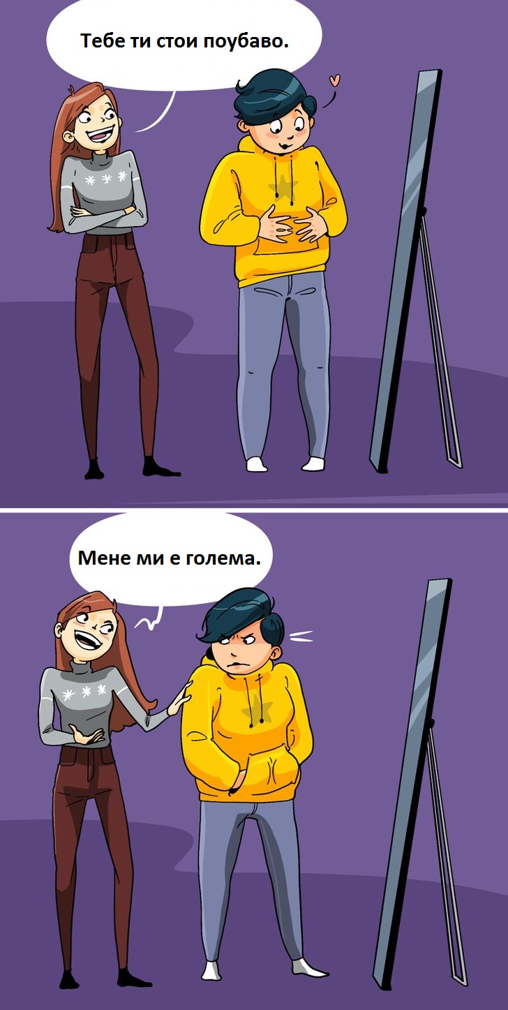 Во овој случај, личноста може да кажува само факт. Но, големата и широка облека честопати се смета за нешто негативно, па можеби личноста се обидува да ве натера да се чувствувате лошо. Наместо да се фокусирате на можната навреда, потенцирајте дека вам ви стои многу подобро.