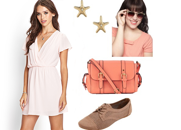 За покласичен изглед одберете чанта во корална боја која привлекува внимание, ниски оксфордки, како и накит со летен шмек како обетки во форма на морска ѕвезда.