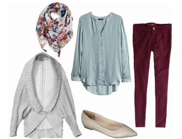 Пастелните бои ќе бидат наголемо застапени оваа пролет. Одберете свилена кошула и удобен, отворен џемпер. Искомбинирајте ги со тесни панталони во нијанса на вино или боровинка, цветна марама и рамни балетанки во светла и нежна боја. Овој изглед е контраст на жешко црвени нијанси и ладно сини, но сепак постигнува одличен ефект.