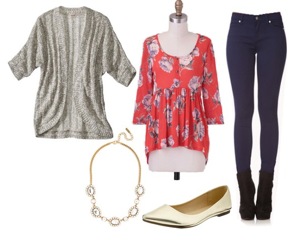 Започнете го изгледот со тесни фармерки, широка цветна кошула и сив долг џемпер. За впечатлив крај одберете златни металик балетанки и парче накит.