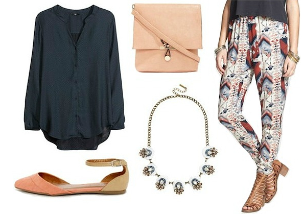 Одберете широки и удобни панталони со геометриски принт, ниски балетанки и широка темносива кошула. Торба за преку рамо и нежно ланче се одлични аксесоари за надополнување на овој изглед.