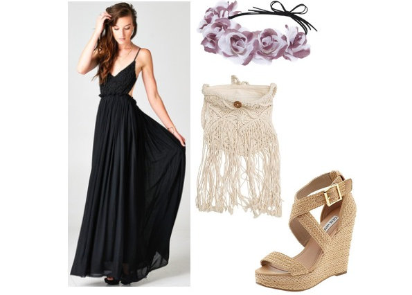 Оваа комбинација е совршена за девојките кои сакаат да бидат женствени без оглед на каков настан присуствуваат. За повпечатлив изглед одберете макси фустан кој одлично оди во комбинација со цветни аксесоари за коса како впечатлива цветна круна. Дополнете го изгледот со сандали на полна плута и еднобојна торба за преку рамо.