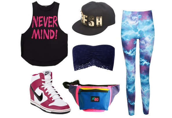 Овој изглед е за смелите девојки кои можат да носат кич парче облека или аксесоар и пак да изгледаат кул. Одберете ги најлудите хеланки кои ги имате, за оваа пригода одлични се флуоресцентните, и искомбинирајте ги со смела маичка со натпис и спортски обувки. За крај, одберете впечатлива капа и шарена торбичка за околу половина.