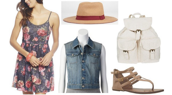 Фустан со цветен дизајн и тексас елек се совршена комбинација која може да ја надополните со плетен шешир, ранец и рамни сандали.