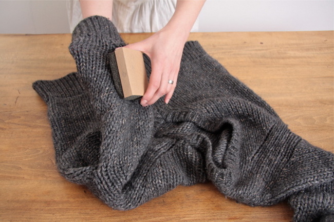 Иако мекиот сунѓер и мекиот џемпер не се поими кои се врзуваат еден за друг, сепак во овој случај токму сунѓерот може на вашиот џемпер да му даде нов сјај. Лесно и на мала оддалеченост со грубата страна од сунѓерот поминувајте преку „топчињата“ кои би требало да се фатат на грубата текстура на ова кујнско помагало.