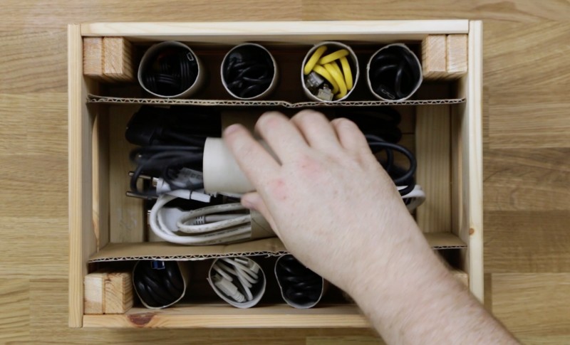 Заплеткани кабли – ова е честа непријатност. Меѓутоа, постои едноставно решение, а сѐ што ви е потребно се неколку празни ролни тоалетна хартија, две парчиња картон и кутија во која ќе ги ставите сите работи. Најпрво, раздвојте ги каблите еден од друг. Завиткајте го секој кабел и ставете го во ролна од тоалетна хартија. Подредете ги ролните во редот на спротивните краеви од кутијата. За да ги спречите да се мрдаат, оградете ги со парчиња картон. Помеѓу картонот би требало да има малку простор. Тука можете да ги чувате останатите уредно завиткани кабли.