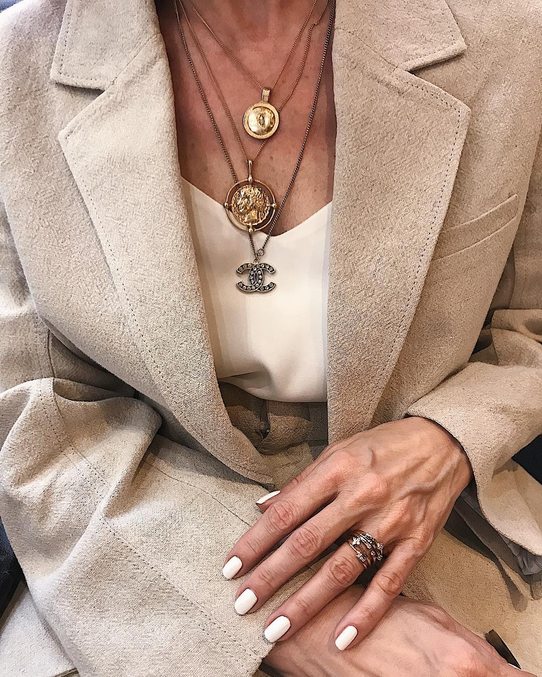 Играјте си со текстурите и усогласувањето на различни видови ланчиња, но погрижете се барем еден од нив да се издвои така што ќе остави забележителен впечаток со својот приврзок. Оваа комбинација е идеална со бела кошула.