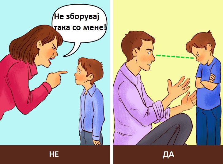 Сепак, не дозволувајте му вашето дете да почне повторно да презборува. Објаснете му дека треба да го поправи своето однесување и клекнете на ниво на неговите очи додека разговарате со него.