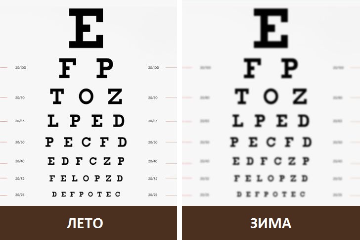 Вашите очи може да бидат повеќе изложени на ризик во текот на зимата отколку во текот летото. Честопати заборавате да носите очила за сонце што ги блокираат УВ-зраците, но сонцето што се рефлектира од снегот може сериозно да ги оштети вашите очи. Очите се многу чувствителни на сув воздух и ветер, а тие може да доведат до сушење. Лекарите препорачуваат употреба на вештачки солзи во зима кога сте надвор.