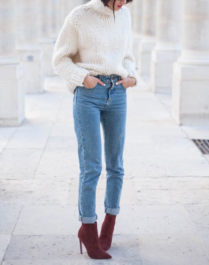 3. Џемпер во форма на ролка + Рамни фармерки + Чизми со високи потпетици