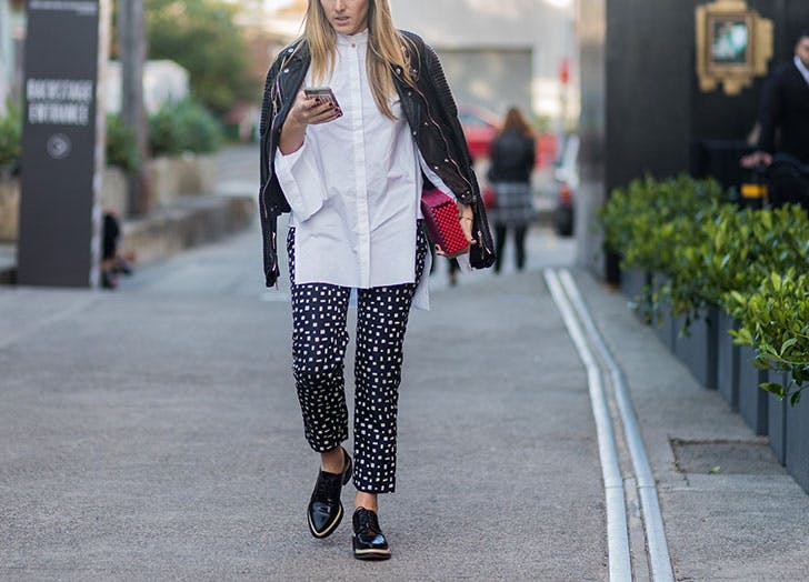 Доколку сакате нешто покласично и „примерно“ за секојдневни прилики, тогаш едноставната комбинација од панталони со принт и класична бела кошула, „освежете“ ја со кожна јакна во моторџиски стил. Одберете и некои впечатливи аксесоари и заблескајте во оригинално издание, дури и во канцеларијата.