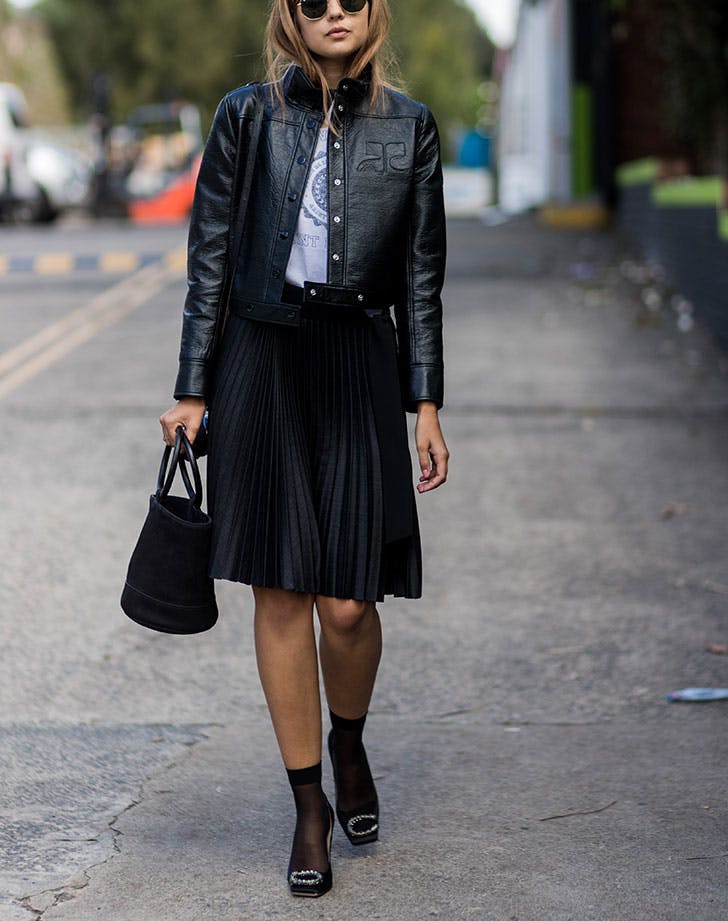 Миди плисираните здолништа се доста популарни, а доколку ги комбинирате со машка блуза со натпис, ќе добиете кул модна комбинација која е одлична за некои секојдневни прилики. Секако, кожната јакна е задолжителна во овој случај.