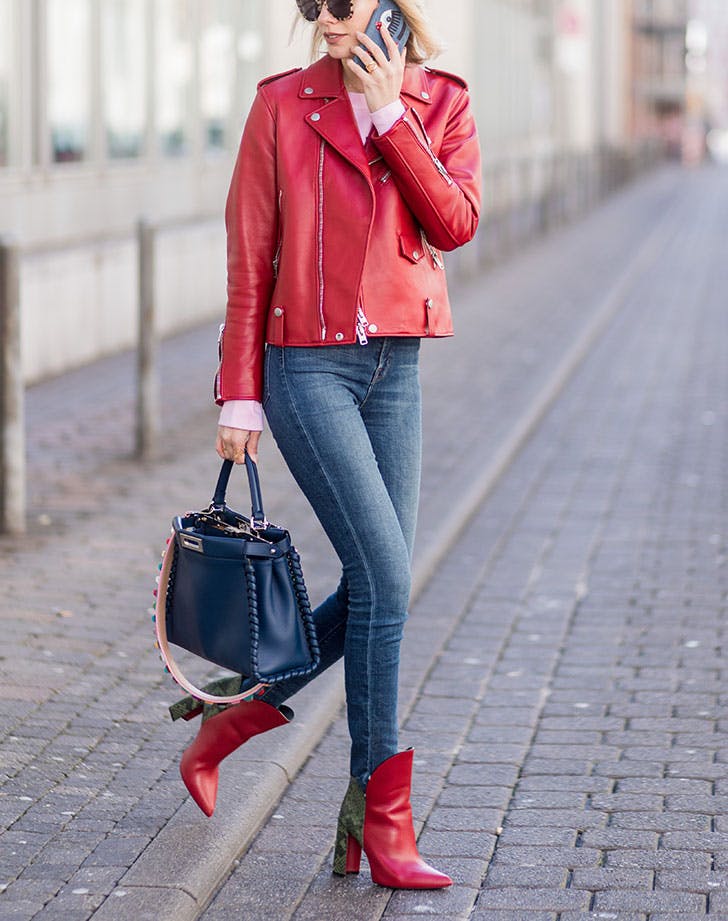 Тесните фармерки и кожната јакна се љубов која ќе трае засекогаш, а ако избирате кожна јакна во некоја впечатлива боја, секогаш можете да направите одлична модна комбинација така што ќе облечете и чизми во истата боја. Монохроматскиот стил е прифатлив, дури и кога боите кои ги користите не се црна, бела или крем.