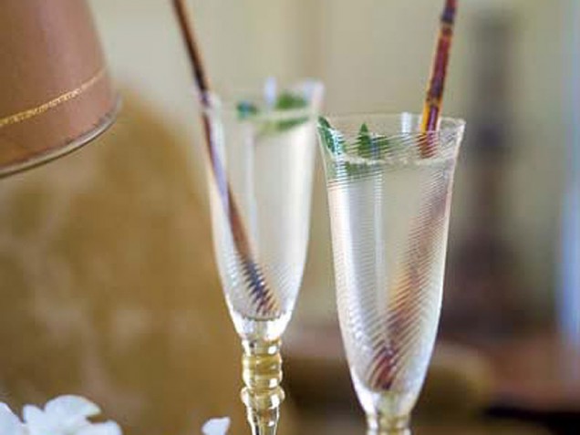Земете неколку тенки високи чаши за вино и во нив ставете 1/3 искршен мраз. Потоа додадете од измешаниот пијалак уште 1/3, а последната третина пополнете ја со шампањско. Декорирајте со неколку ливчиња нане.
