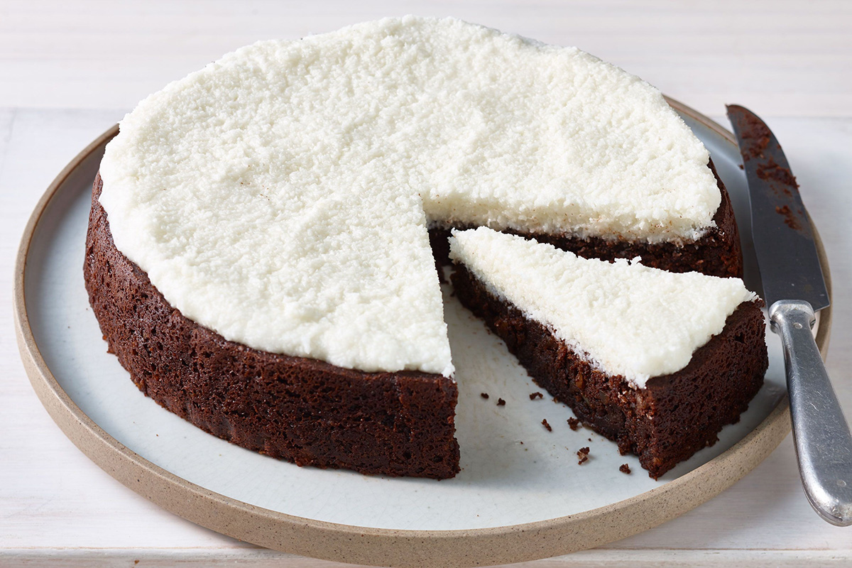 Загрејте ја рерната на 180 степени и поставете хартија за печење во поголема тава. Сипете ја смесата во неа и печете околу 40-тина минути. Додека чекате кората да се олади, направете ја глазурата така што на тивок оган ќе ја стопите млечната чоколада заедно со слатката павлака. Прелијте ја глазурата на оладената кора, притоа внимавајќи да не се слее по краевите и просејте кокос во прав над неа. Оставете ја тортата да отстои во фрижидер за добро да се зацврсти.