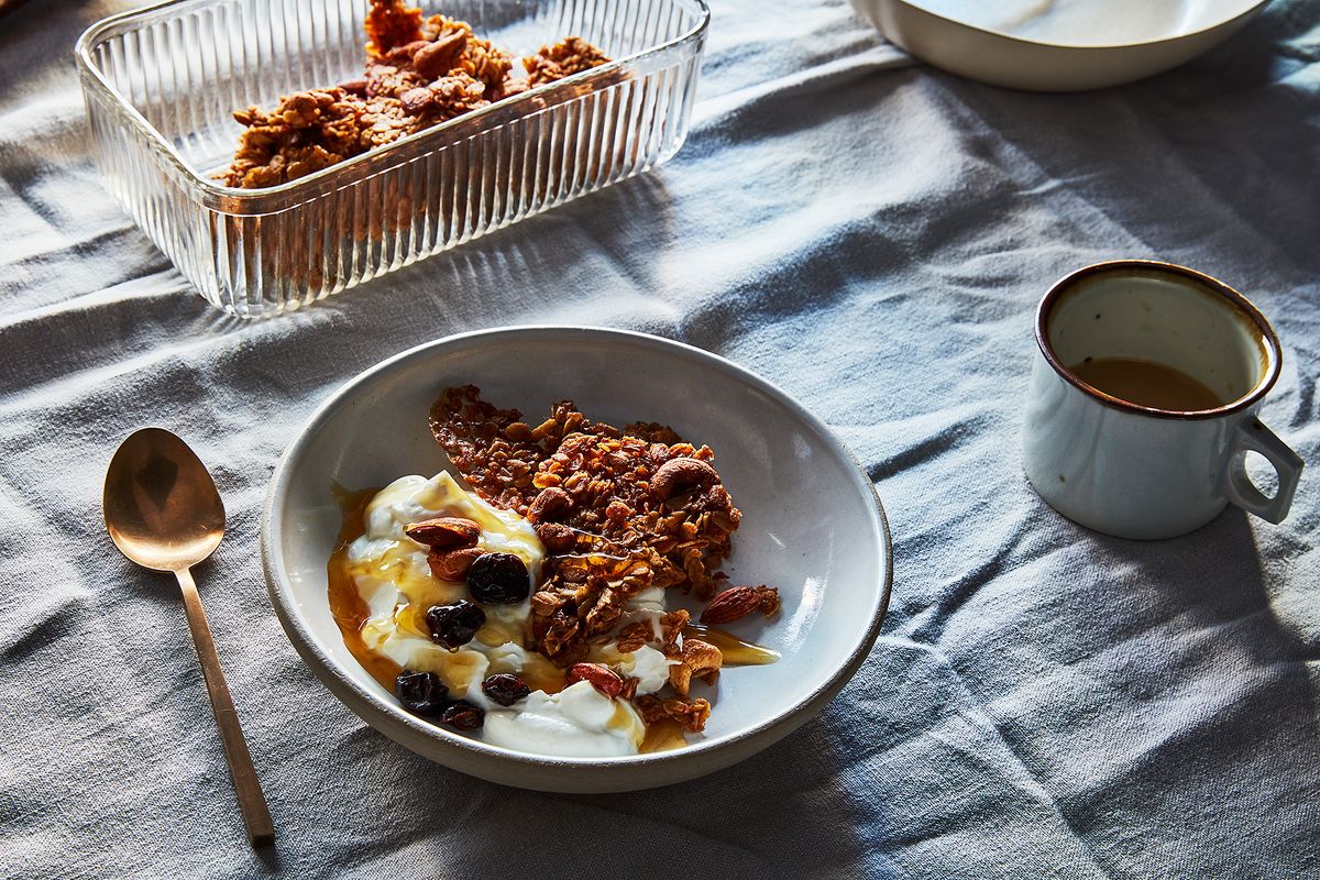 Вклучете ја рерната да се грее на 160 степени Целзиусови. Во голем сад промешајте ги сите суви состојки, поточно сѐ освен кокосовото масло и оризовиот сируп. Потоа, растопете го кокосовото масло и сите состојки добро измешајте ги. На тавата ставете хартија за печење и на него рамномерно посипете ја смесата и печете околу 25 минути со повремено мешање за да е испечена подеднакво. Изладете ја и послужете ја со јогурт и свежо овошје по желба.