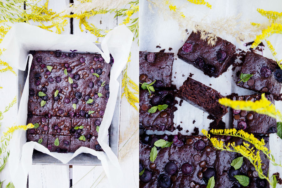 Брашното, солта и содата измешајте ги заедно. Во смесата додајте го мармаладот од сливи и мешајте уште една минута. Додајте го растопеното чоколадо и мешајте додека не се соединат сите состојки. Смесата ставете ја во тавата за печење, одозгора ставете боровинки и печете 45 минути. Кога десертот ќе биде готов, извадете го од рерна, изладете го и уживајте во вкусот.