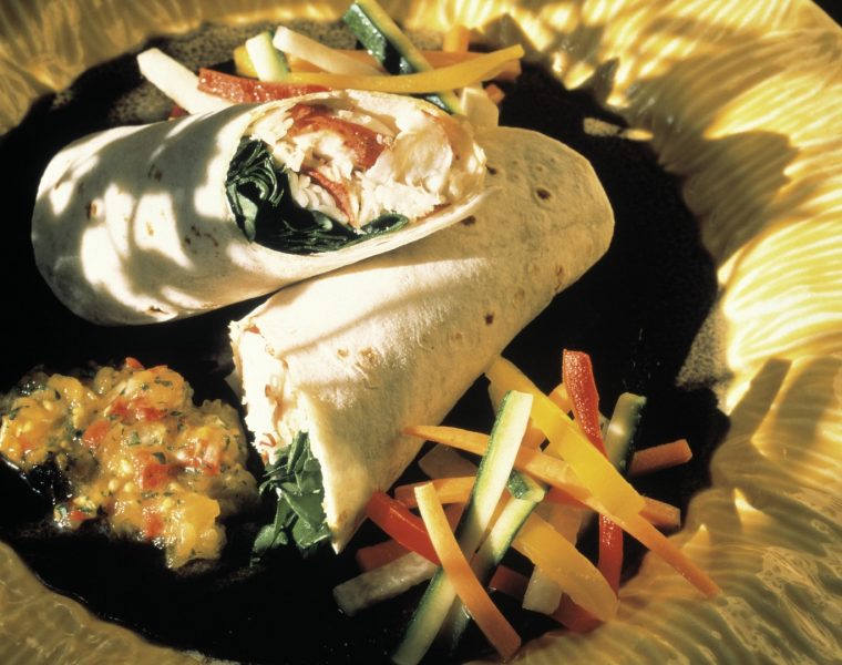 Прво распоредете ги тортиљите со сосот, па врз нив ставете го филот и потоа додајте го ренданото сирење и зелената салата. Завиткајте.