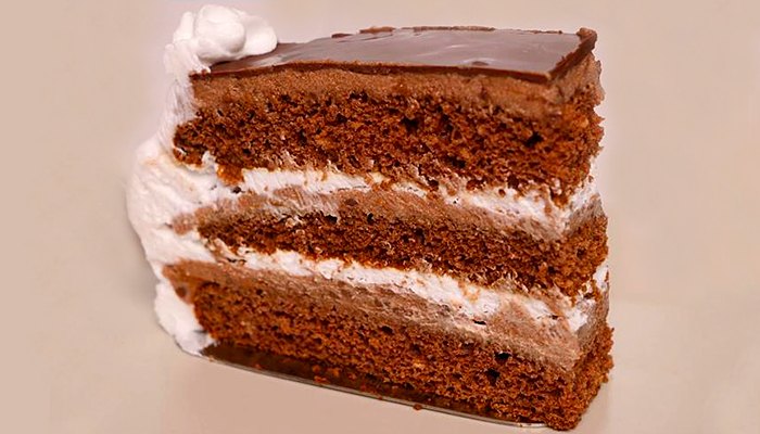 5. Намачкајте ги корите така што првин ќе го нанесете кремот, а потоа шлагот. Постапката повторете ја додека не ги наредите сите кори. Врвот на колачот прелијте го со крем, а остатокот со шлаг. На крајот растопете 100 грама чоколадо за чоколадна глазура.
