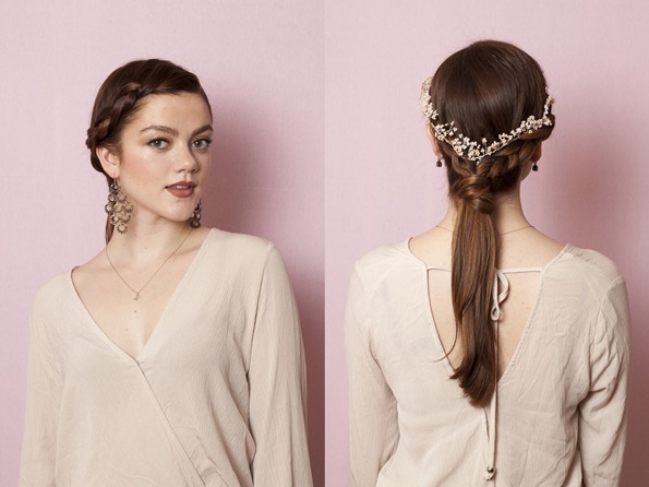 3. Истото направете го и со другата страна, па на крај спојте ги двете плетенки и врзете ги во опавче. Извлечете еден прамен за да го замотате околу ластикот.