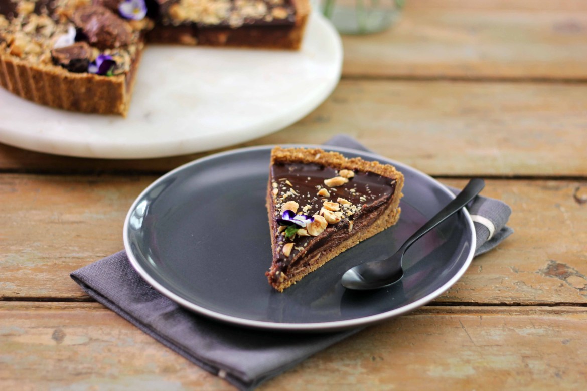 Извадете ја основата од фрижидер и сипете ја мешавината со Нутелата врз неа, внимателно израмнувајќи го врвот. Вратете повторно во фрижидер.