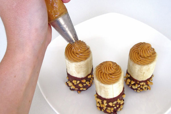 3. Во шприц за декорирање торти ставете го путерот од кикирики и наполнете ги бананите до врв. Наредете ги бананите на еден послужавник и ставете ги во фрижидер за да се стврдне чоколадото.