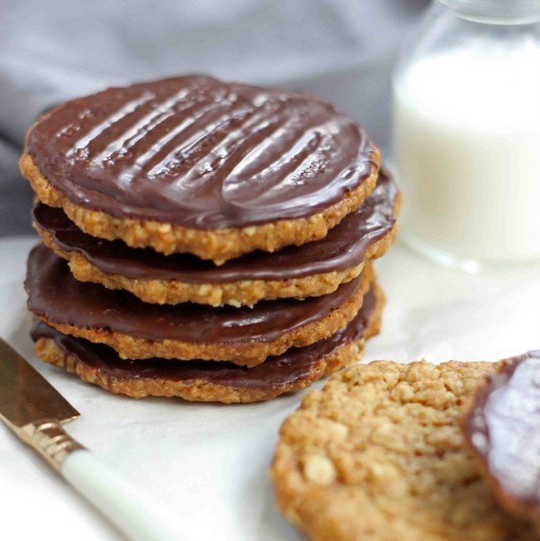 Загрејте ја рерната на 180 степени и поставете хартија за печење во неколку садови за печење. Со помош на миксер, матете ги путерот и шеќерот сè додека не добијат бледа боја и мазна површина, а потоа додајте го и медот и продолжете да мешате додека не сè соединат. Намалете ја брзината на матење и додајте ги овесните снегулки, брашното, сода бикарбоната, прашокот за печиво и солта.