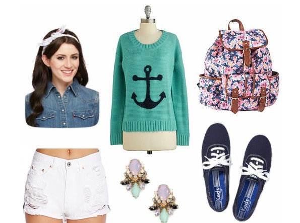 Овој изглед е микс од женствени, слатки и кежуал елементи. Искомбинирајте бели шорцеви со висок струк, може да бидат и искинати, џемпер со впечатлива и освежителна боја како ментол зелена и со интересен принт. Надополнете го изгледот со ниски морнарски патики кои даваат кежуал шмек, цветен ранец и нежни обетки за женственост а како јаготка на шлагот одберете марама за коса.