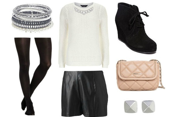 Оваа навистина тренди и елегантна црно-бела комбинација е совршена за на прв состанок. Искомбинирајте црни кожни шорцеви и бел џемпер кој може да биде сосем обичен или да има монисти како украс околу вратот. Не заборавајте ги црните хулахопки кои ќе ве топлат во веќе сè поладните ноќи и црни штикли или чевли со висока плута кои ќе ги истакнат вашите нозе и ќе добиете впечатлив изглед без многу труд. За крај одберете мала плик чанта, сребрени алки и нежни сребрени обетки.