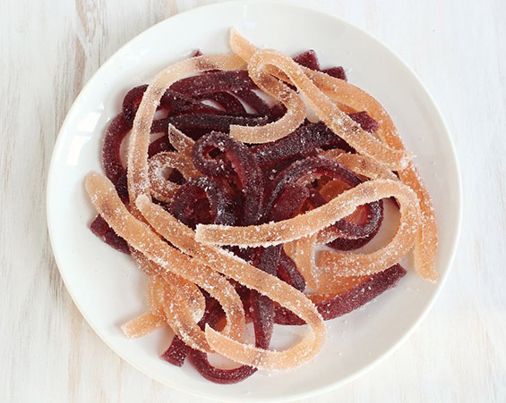 За да си направите црвчиња, желатинската смеса од тавчето пренесете ја на даска за сечкање и со остар нож исечете ја на ленти. Други интересни форми можете да добиете ако користите модли за колачиња, а за различни вкусови едноставно експериментирајте со овошните сокови.