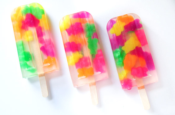 Наполнете ги модлите со спрајт до ¾ од нивниот капацитет. Пуштете во нив колку сакате гумени бонбони. Наместете ги стапчињата и оставете ги сладоледите во замрзнувач да преноќат. Следното утро – уживајте!