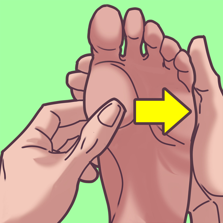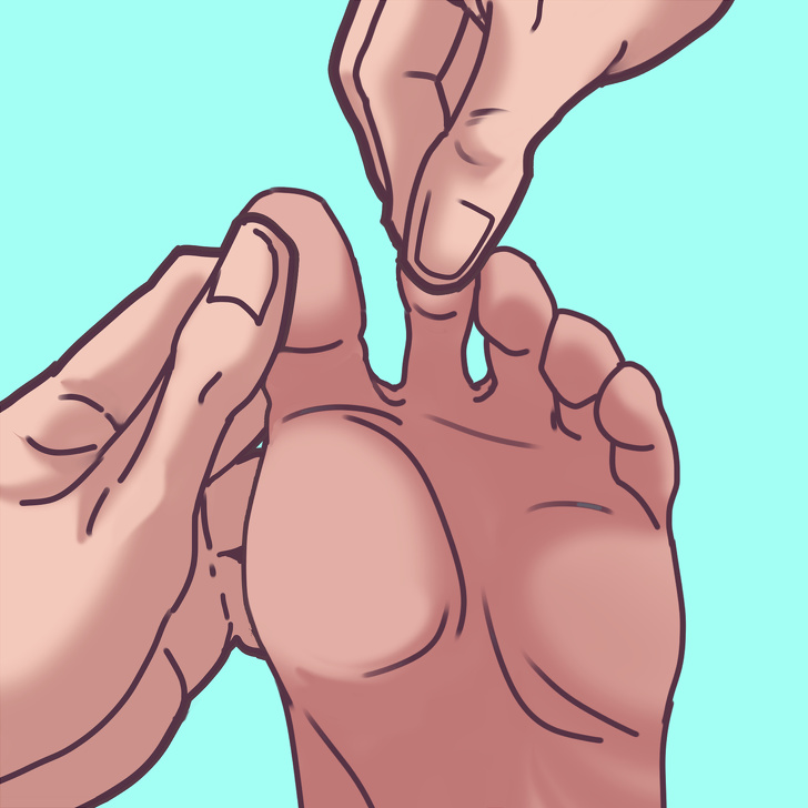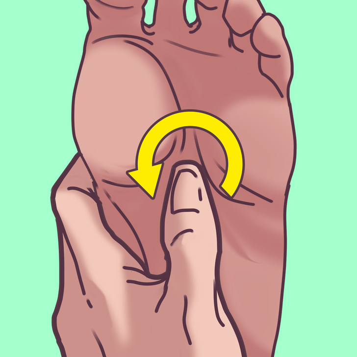 Легнете на грб и свиткајте ги колената. Земете го стапалото во рака и опфатете го со прстите. Ќе почувствувате вдлабнатина на дното од стапалото. Притиснете ја оваа точка и масирајте ја со кружни движења. Повторете ја масажата и со другото стапало.