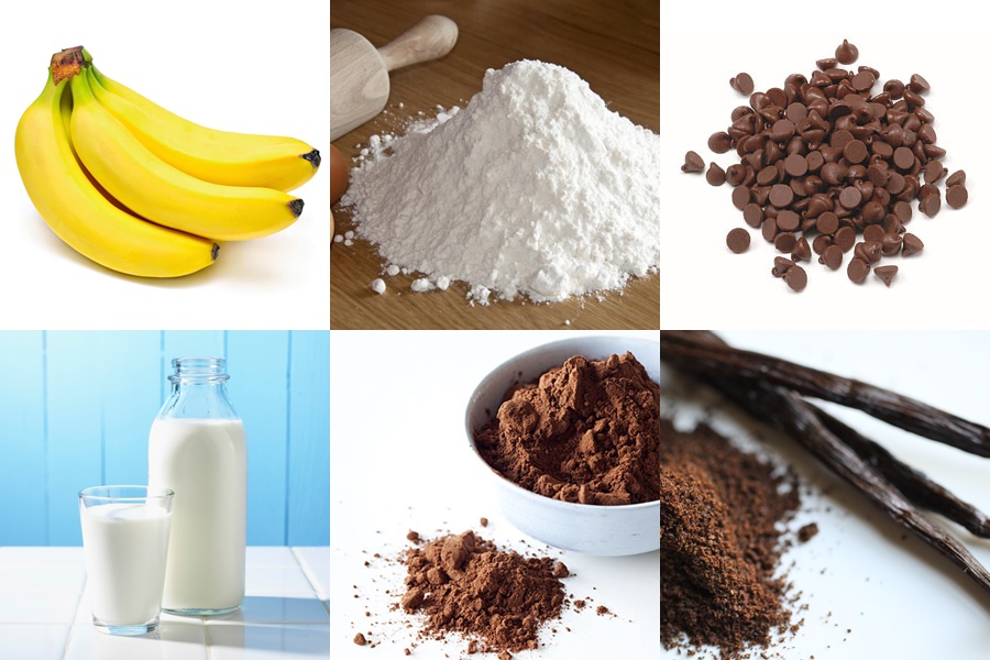 Загрејте ја рерната на 180 степени, а тавата (со големина отприлика 20×10) обложете ја со хартија за печење. Во подлабок сад измешајте го брашното, какаото, сода бикарбоната и солта. Во друг подлабок сад додадете ги јајцето, жолчката, млекото и ванилиниот шеќер и добро измешајте ги. Потоа комбинирајте ја содржината од двата садови, па додадете ги чоколадните трошки и бананите.