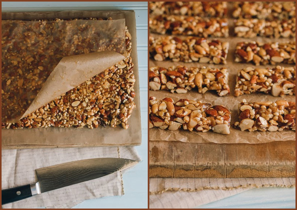 7. Оставете ја смесата да се лади 2 часа. Потоа превртете ја тавата на работната маса и извадете ја стврднатата смеса. Отстранете ја хартијата за печење. Исечете 20 штангли.