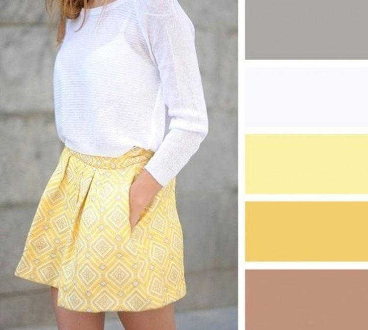 10. Со белата и жолтата најдобро одат светло кафеави и сиви нијанси. Тие можат да бидат и во форма на шари на здолништето или блузата, како и дискретно додатни детали.