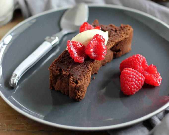 Загрејте ја рерната на 180 степени и премачкајте со масло хартија за печење, поставена во длабока тава од 22 сантиметри. Сместете го чоколадото и путерот во сад кој е отпорен на топлина и поставете го врз тенџере со зовриена вода. Мешајте повремено сè додека смесата не се стопи, измазни и соедини. Тргнете го садот од оган. Додајте половина од шеќерот и веднаш по него жолчките од јајцата. На крај сипете го и брашното.