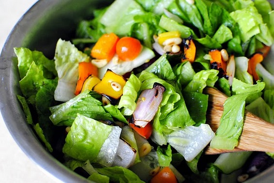 Сите состојки ставете ги во длабока чинија за салата, заедно со кромидот и пиперките на скара. Зачинете со сол, бибер, маслиново масло и оцет по вкус.